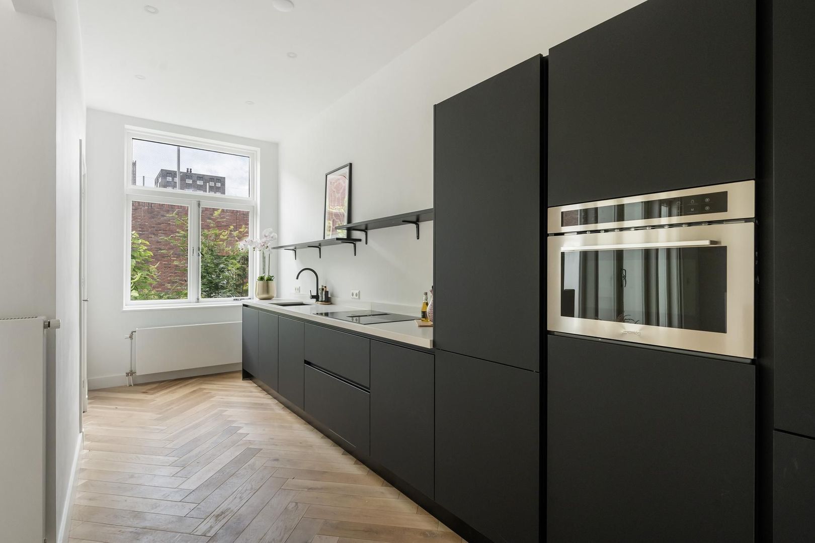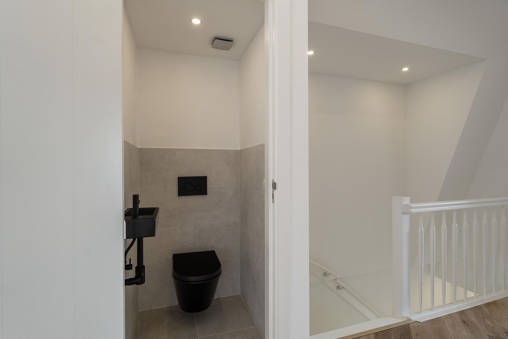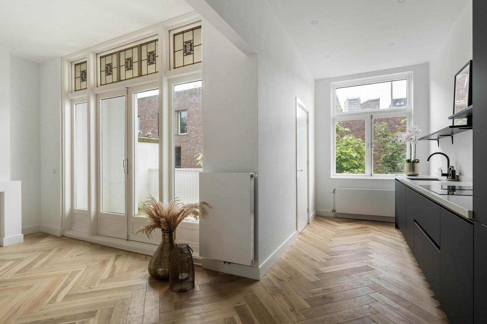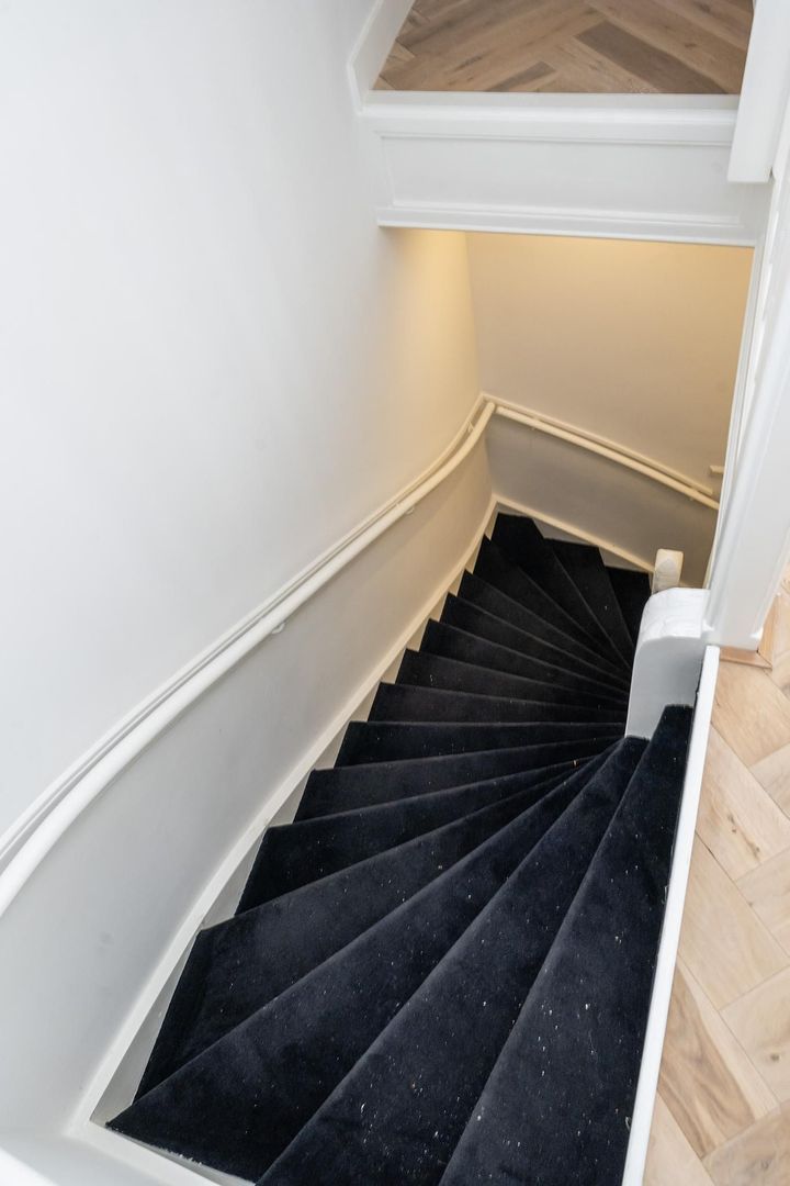 Gezamenlijke entree op de begane grond, trap naar de tweede etage, overloop met apart toilet voorzien van fraai tegelwerk, wandcloset en fonteintje. Vanuit de overloop dubbele stalen deuren naar de woonkamer met voorbalkon en achterterras op de middag en avondzon, zijkamer aan de voorzijde en riante open keuken aan de achterzijde voorzien composiet werkblad, koel-/vriescombinatie, inductiekookplaat met geïntegreerde afzuiging en vaatwasser.