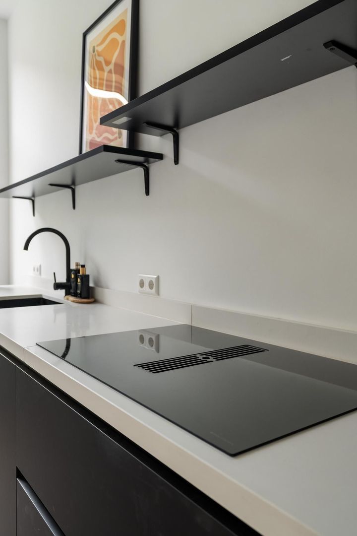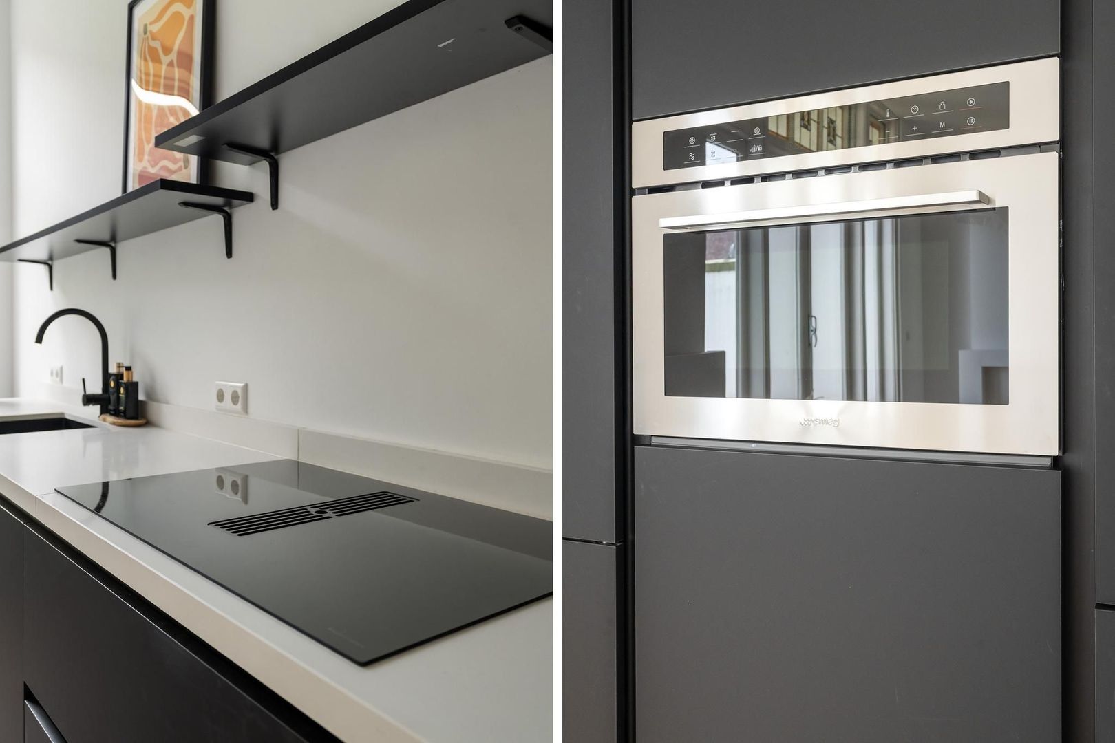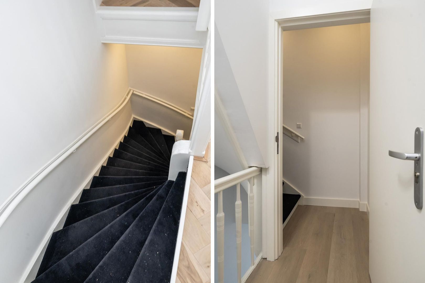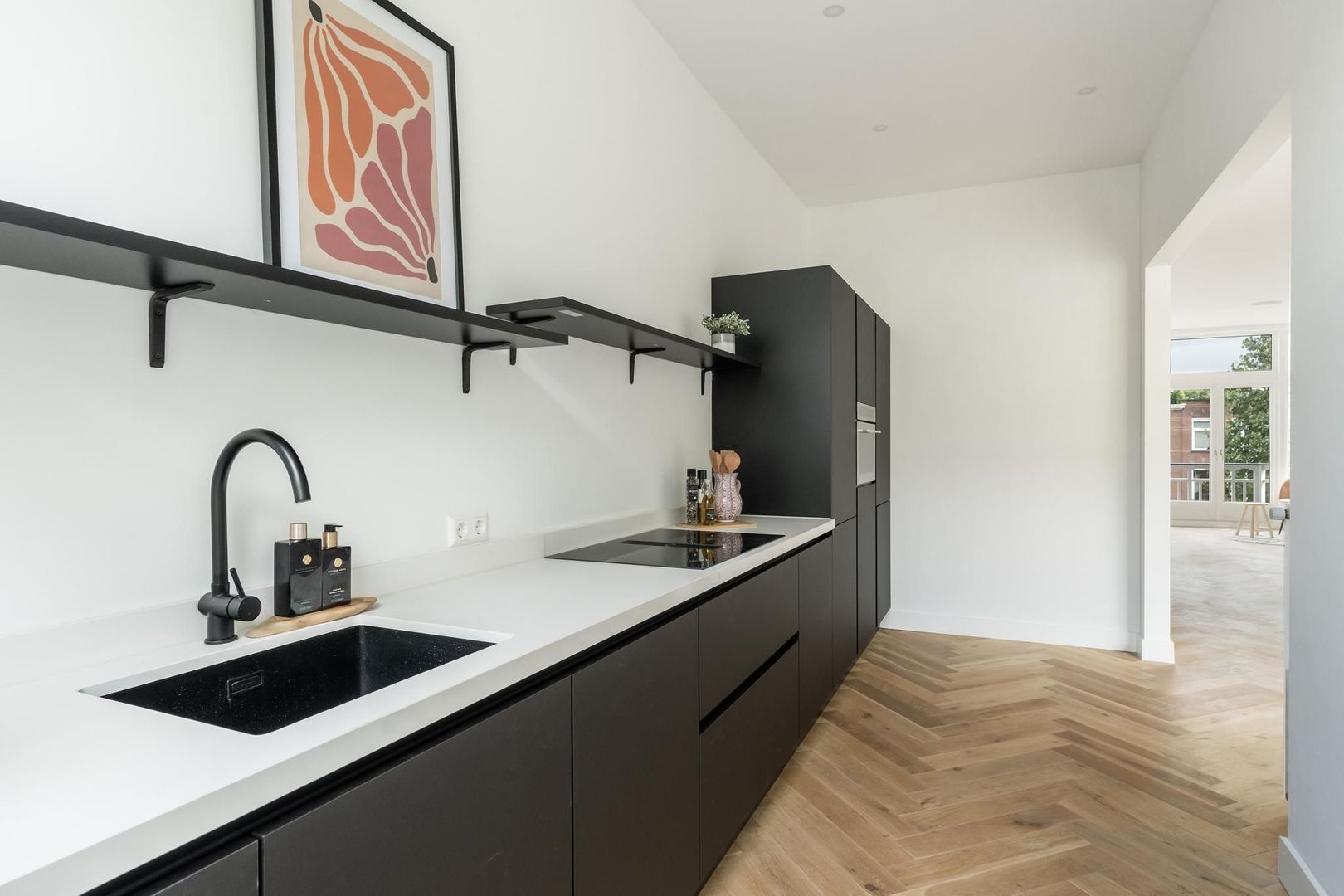 Gezamenlijke entree op de begane grond, trap naar de tweede etage, overloop met apart toilet voorzien van fraai tegelwerk, wandcloset en fonteintje. Vanuit de overloop dubbele stalen deuren naar de woonkamer met voorbalkon en achterterras op de middag en avondzon, zijkamer aan de voorzijde en riante open keuken aan de achterzijde voorzien composiet werkblad, koel-/vriescombinatie, inductiekookplaat met geïntegreerde afzuiging en vaatwasser.
